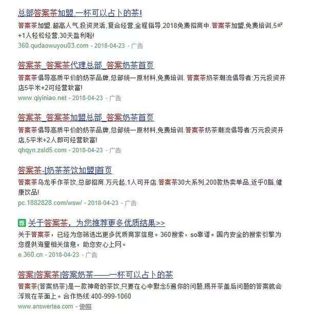 网络上输入“答案茶”关键字,搜索结果大部分是“答案茶”加盟,小知在线询问了若干家,客服纷纷表示自己是正宗,当问及是否有注册商标的时候,大都答非所问,没了下文。