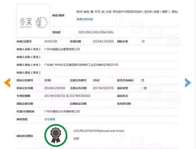 用于餐饮服务的第43类“答案”商标已经在2009年和2015年分别被南京科闰特智能科技有限公司、广州翡晶企业管理有限公司申请成功。重庆喜百味于2018年3月13日提交了“答案茶”在该类目下的注册申请,目前正等待受理中。