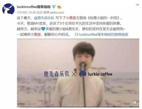 之后,瑞幸还请来了知名民谣乐队鹿先森乐队(代表作《春风十里》)打造了专属音乐《给鹿小姐的一封信》,歌词最后一句为“喝杯小鹿茶,聊聊心里话”。