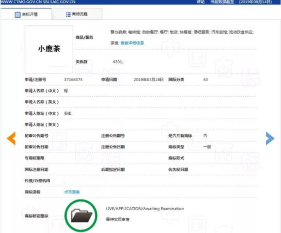 其中,“小鹿茶”的43类商标(指定使用在“备办宴席; 咖啡馆; 自助餐厅; 餐厅; 饭店; 快餐馆; 酒吧服务; 汽车旅馆; 流动饮食供应; 茶馆”等服务上)已经被一个程某于2019年3月28日申请注册。