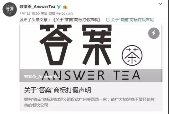如广州美西西餐饮管理服务有限公司自称“答案茶合法商标唯一持有企业”,广州美西西公司微博账号“答案茶_AnsweqTea”发布《关于“答案”商标打假声明》称仅他们公司拥有“答案”商标(第30类方便食品类别),不要轻信其他餐饮公司。