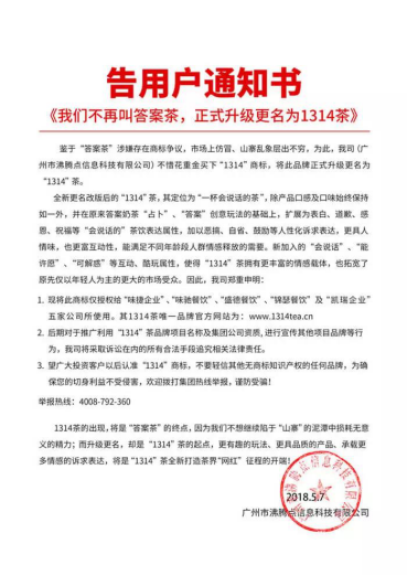 文末称:1314茶的出现,将是“答案茶”的终点,因为我们不想继续陷于“山寨”的泥潭中损耗无意义的精力;而升级更名,却是“1314”茶的起点...将是“1314茶”全新打造茶界“网红”征程的开端!