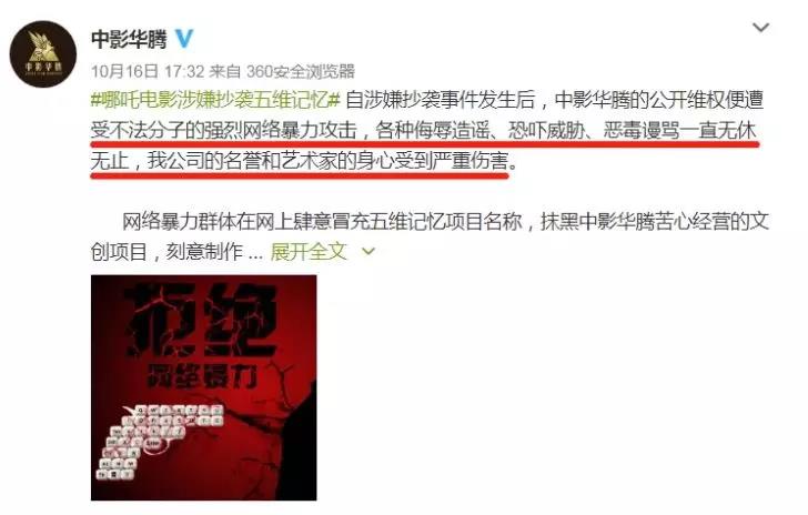 此外,据媒体报道详细消息了解,中影华腾在此前发布《律师声明》后被无视且无正面回应,并且遭到网络暴力,因此将《哪吒》出品方以及导演起诉至法院要求索赔5000万元,并要求对方刊登声明消除影响以及承担合理费用100万元等。现如今《哪吒》及出品方、饺子导演等暂无回应。