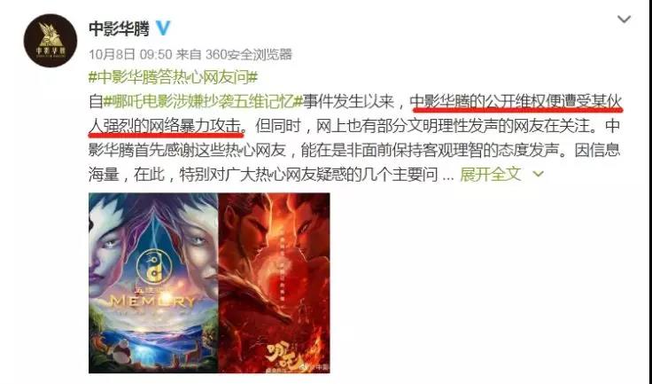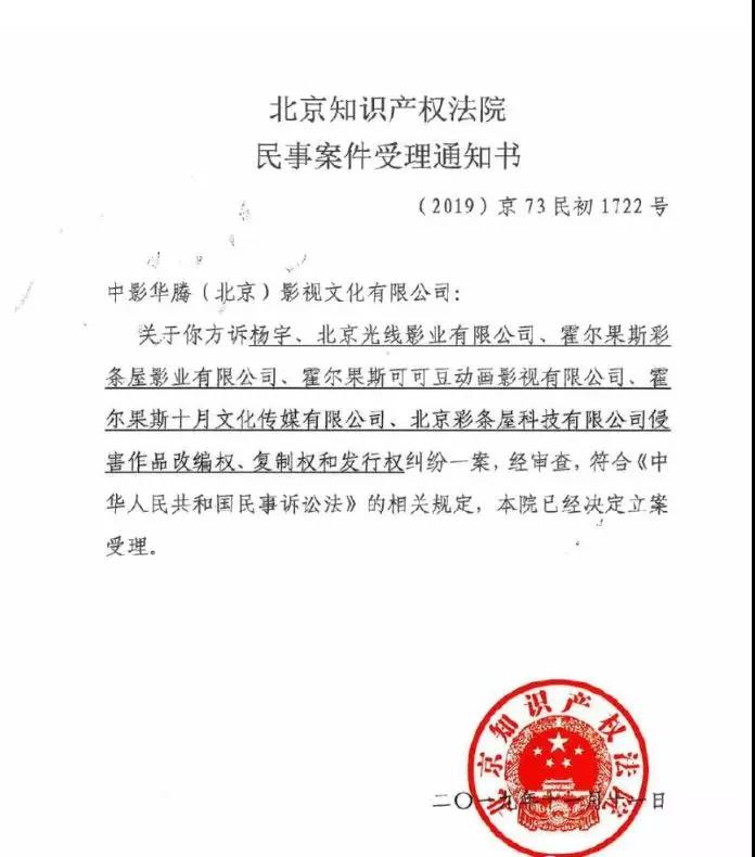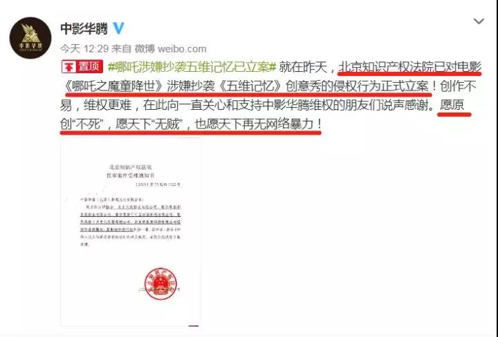 如今《哪吒》已经下映,中影华腾依然坚持维权。11月12日,中影华腾发文称北京知识产权法院已对电影《哪吒之魔童降世》涉嫌抄袭《五维记忆》创意秀的侵权行为正式立案!同时表态:原创“不死”,愿天下“无贼”,也愿天下再无网络暴力!从文件可见,中影华腾一共起诉了名为杨宇的人及五家公司,引发关注。